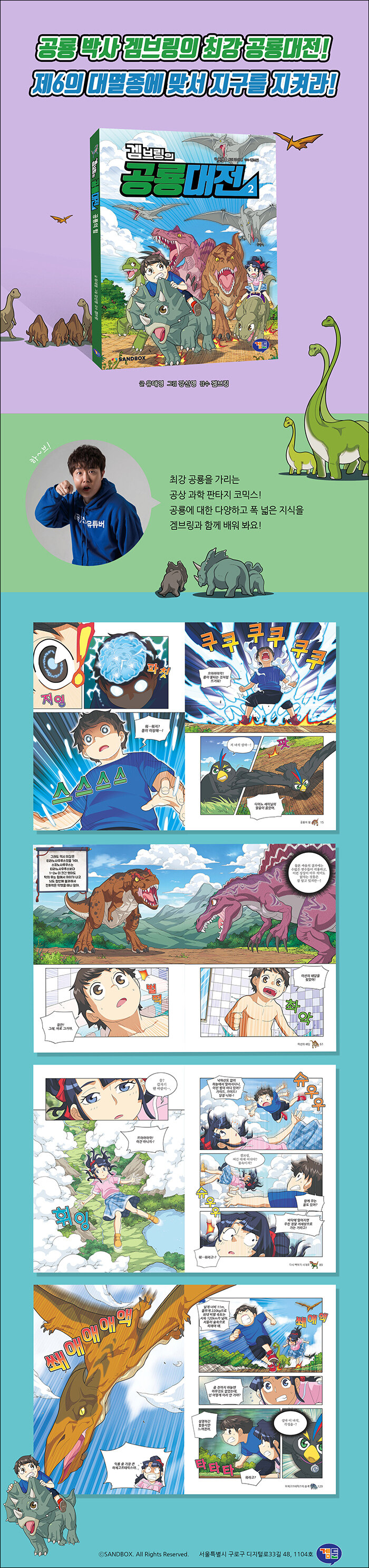 《겜브링의 공룡대전》은 공룡이 멸망한 이유에 대한 가설과 공룡에 대한 지식을 폭넓고 재미있게 담은 공상 과학 판타지 코믹스입니다. 백악기 시대로 돌아간 겜브링을 통해 공룡에 대한 지식은 물론, 환경 보호의 소중함까지 배울 수 있을 거예요.