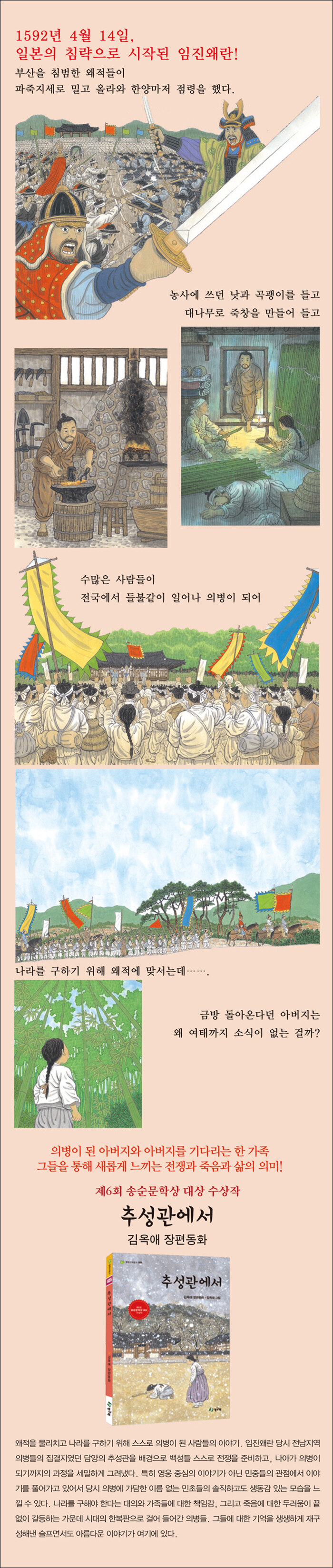 임진왜란은 아동문학에서도 자주 다루어져 온 소재일 뿐 아니라 교과과정에도 포함되어 있어 아이들도 잘 알고 있을 터이다. 그러나 당시 의병의 활동상에 대해서도 잘 이해하고 있을지는 의문이다. 아이들은 흔히 임진왜란 하면 이순신 장군과 거북선을 쉽게 떠올릴 것이다. 위인 중심의 역사 교육 탓도 있지만 아동서사에서는 단연 영웅의 활약상이 흥미를 자아내기에 적합해서일지도 모른다. 하지만 역사의 고비마다 두드러져 보이는 뛰어난 영웅들의 업적은 그 이면에 가려진 이름 없는 민초들의 희생과 헌신이 있었기에 가능했다는 것도 잊어서는 안 될 것이다. 만약에 들불같이 일어나 왜적의 총칼 앞에 스러져 간 의병들이 없었다면 과연 이 땅에서 왜군을 몰아내고 나라를 지켜낼 수 있었을까? 따라서 아이들에게 임진왜란을 의병들의 시선을 따라가며 다시 들려줄 필요가 있다.