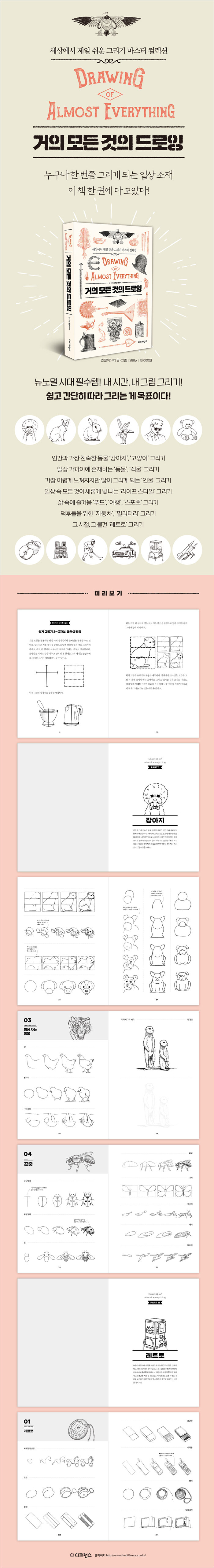 《거의 모든 것의 드로잉》은 강아지부터 고양이, 동물, 식물, 인물, 라이프 스타일, 푸드, 여행, 스포츠, 자동차, 레트로, 밀리터리까지 총 12개의 주제로 분류해 다양한 그림을 과정과 함께 모아 놓았다. 그림을 그릴 때 미술 시간에 배웠던 원근감, 투시, 구도 등은 중요하지도 않고, 알 필요도 없다. 어느 것을 그리든 쉽고 재미있게 따라 그리는 것이 목표이다. 그런 점에서 이 책은 그리는 방법을 자세히 설명하지 않는다. 이미지를 완성하는 과정도 3단계에서 많게는 5단계면 끝이다. 기본 도형에서 시작해 선을 다듬고 추가하다 보면 원하는 그림이 완성되는 놀라운 경험을 하게 된다. 책에 나온 과정을 따라 그리다 보면 ‘이렇게 간단하게 그릴 수 있구나!’, ‘그동안 그리기를 내가 너무 어렵게 생각했어!’라고 깨닫는 시간이 될 것이다. 이제부터 이 책 한 권으로 거의 모든 것을 쉽고! 재미있게! 그리는 시간이 되길 기대한다.