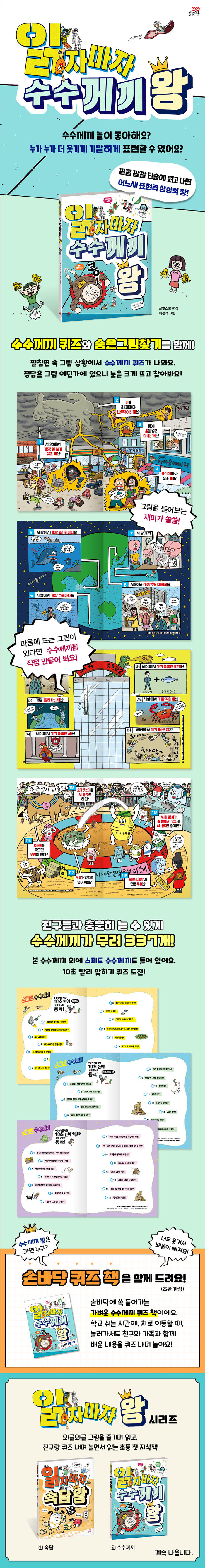 동네, 시장, 분식집, 놀이터, 우주, 비밀의 탑, 숲속, 캠핑장, 씨름 대회, 소림사, 기찻길, 우주선 등 70여 가지 다양한 상황 속에 담은 다양한 수수께끼를 만난다. 수수께끼 문제를 내고 답을 알아맞히는 것도 재미있지만 그림 한 컷 한 컷, 사람과 사물, 상황 속의 동작 하나 하나도 재미있다. 그림 곳곳에 숨어 있는 유머를 뜯어보는 재미가 쏠쏠할 것이다.