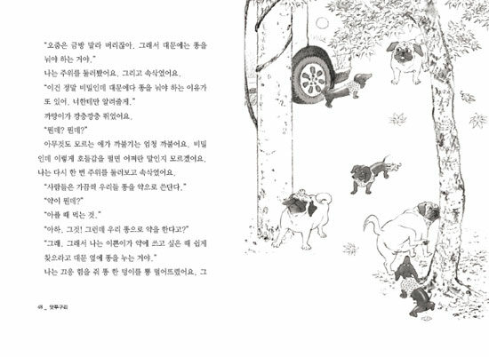 가족들이 떠나던 날, 앗쭈구리는 생판 모르는 새 가족들 틈에서 무섭고 화가 났을 거예요. 잠을 자는데 코를 드릉드릉 천장이 무너지도록 골았대요.