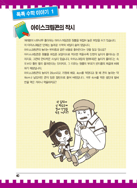 ● 두 가지 학습 콘텐츠 ‘쏙쏙 수학문제’, ‘톡톡 수학이야기’ <테일즈런너 수학킹왕짱> 18권의 쏙쏙 수학문제에서는 소수에 관한 문제들을 다룬다. ‘소수의 계산’, ‘몫을 반올림하여 나타내기’, ‘올림과 내림’ 등 다양한 문제가 수록되어 있다. 문제들은 상중하 난이도로 구성되어 있어 쉬운 것부터 어려운 내용까지 차근차근 경험해 볼 수 있다. 변별력 있는 문제들과 함께 학습되는 여러 ‘풀기’ 문제를 통해 좀 더 폭 넓은 수학의 세계를 경험할 수 있을 것이다.