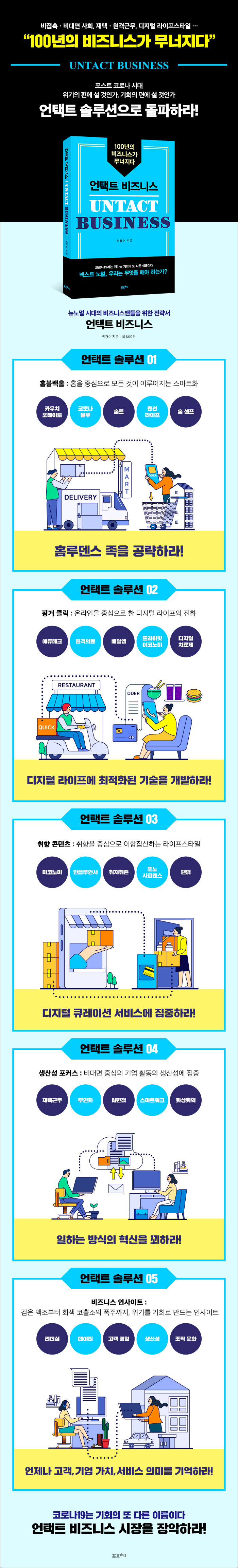 “언택트 솔루션으로 돌파하라”포스트 코로나 시대는 이미 우리 곁에 다가와 있다. 다만 우리가 이를 얼마나 잘 인식하고 중요하게 여기느냐의 차이일 뿐이다. 과거부터 지금까지, 그리고 미래에도 이런 변화는 계속해서 일어날 것이다. 수많은 변화의 파편들이 축적되어 빅뱅처럼 한순간에 우리의 삶을 바꿀 것이다. 우리는 지금 그런 변화에 익숙해지기 위한 한 발을 잠시 디뎠을 뿐이다. 언택트는 ‘사람’에게 집중하는 시대를 만들었다. 인간은 사회적 동물이라는 명제처럼 언택트하면 할수록 콘택트하고 싶어한다. 기업도 마찬가지다. 재택ㆍ원격근무가 활발해지고 디지털 기술이 발전하면서 리더와 직원들은 점점 ‘의미’에 집중하게 되었다. 결국 의미를 찾는 기업의 행위는 콘택트하고 싶어하는 사람들의 숨은 욕구를 찾는 일이기 때문이다.