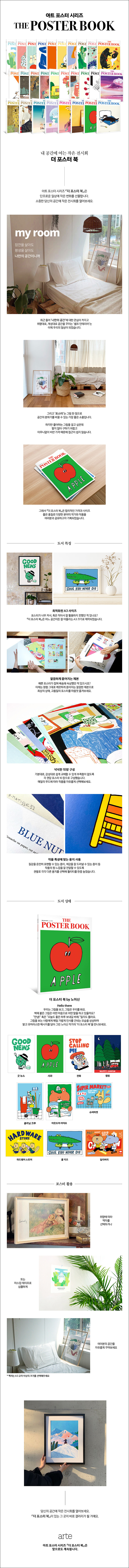 잠깐을 살아도 평생을 살아도 내 공간이니까우리는 살면서 반 이상의 시간을 집 또는 개인의 공간에서 보냅니다. 오롯이 내가 쓰고, 내가 꾸미는 그 공간은 삶의 감정을 그대로 담아내 변화도 많고 그만큼 애착도 가득하지요. 그 특별한 공간을 좋아하는 만큼 취향에 맞는 소품으로 채워 세상에서 가장 사랑스러운 장소로 만들어보는 건 어떨까요? 『더 포스터 북』은 여러분의 곁에 두고 평생을 함께할 가장 좋은 소품입니다. 『더 포스터 북』 속 좋아하는 작가, 그리고 다양한 포스터 작품을 매일의 감성대로 꾸며 여러분의 공간에 작은 전시회를 열어보세요. 그리고 그 공간을 사랑해주세요. 잠깐을 살아도 평생을 살아도 하나뿐인 내 공간이니까요.