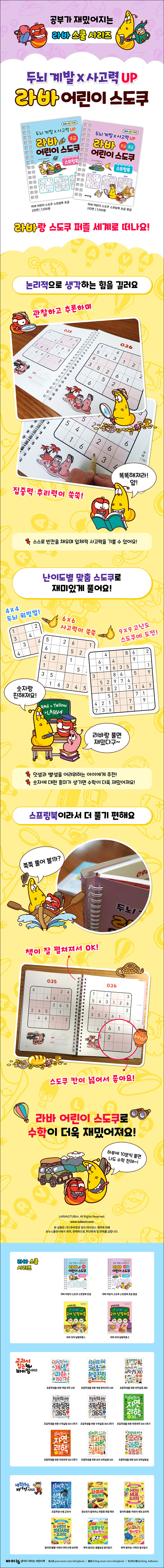 보물섬을 찾아 떠나고 우주를 탐험하는 라바와 함께 재미난 스도쿠 퍼즐 여행을 떠난다. 스도쿠를 매일 풀다 보면 두뇌 계발은 물론 숫자에 흥미를 느끼고 수학이 재밌어질 것이다. 문제에 도전하고 해결하는 즐거움도 느낄 수 있다. <라바 어린이 스도쿠 스프링북 초급>, <라바 어린이 스도쿠 스프링북 초급 중급>을 만나 보자.