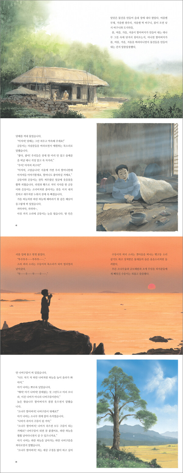 《고양이 학교》, 《아가 마중》의 김재홍 화가가 표현해 낸 아름답고 섬세한 그림! 에스파스앙팡상, 앵코뤼티블상 등 세계적인 상을 수상한 김재홍 화가가 동화의 따뜻한 감성을 그림으로 그려 냈다. 옛 시절을 아름답게 재현한 동시에 동화가 말하고자하는 주제의식을 세심하게 표현했다. 김재홍 화가는 아련하고 깊이 있는 색감을 통해 자연의 아름다운 정경을 온전히 담아냈다. 그뿐만 아니라 그리움과 애정의 시선, 애틋한 뒷모습, 기다림의 손짓 등 인물의 희로애락을 섬세하게 그려 냈다. 김재홍 화가의 그림을 통해 옛 시절에 대한 향수와 동화의 감동을 충분히 느낄 수 있을 것이다.