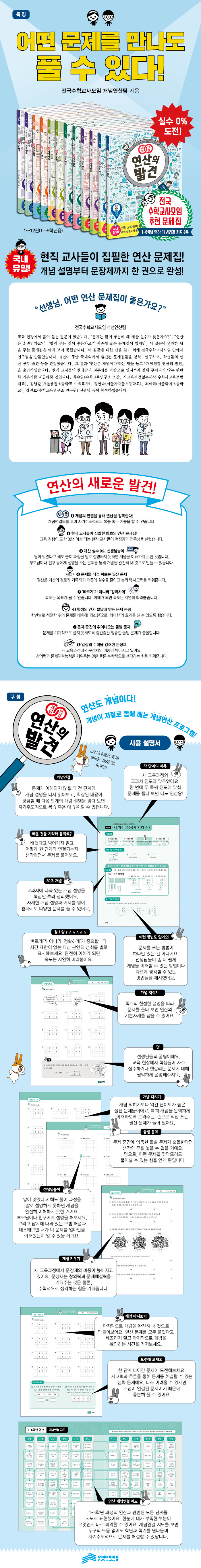 교육 현장에서 많이 듣는 질문이 있습니다. ‘선생님, 어떤 연산 문제집이 좋은가요?’, ‘문제는 많이 푸는데 왜 계산 실수가 잦은가요?’, ‘연산은 훈련인가요?’, ‘빨리 푸는 것이 좋은가요?’ 시중에 많은 문제집이 있지만, 이 질문에 명쾌한 답을 주는 문제집은 아직 보지 못했습니다. 아이들이 처음으로 접하는 수학이 연산인데, 수학에 대한 첫인상이 많이 오염되어 있습니다. 이 질문에 대한 답을 찾기 위해 전국수학교사모임 내 연구 모임을 만들었습니다. 4년여 동안 초등수학 교육과정과 아이의 발달과정에 맞는 미래형 연산 프로그램을 개발하기 위해 국내외에서 출간된 문제집들을 분석?연구하고, 학생과 학부모 대상으로 인터뷰를 진행했습니다. 그 결과 ‘연산은 개념이다’라는 답을 들고 『개념연결 연산의 발견』을 출간하였습니다. 교육 경험이 도합 80년 이상인 현직 교사들의 현장감과 전문성을 살려 입시까지 절대 무너지지 않는 탄탄한 기본기를 제공하는 연산 프로그램입니다. 최수일수학교육학 박사(수학교사의 전문성에 관한 연구)로 30여 년 넘게 수학교육계에 있으면서 즐겁고 행복한 수학을 위해 실험과 연구를 계속해왔습니다. 수학교사들의 연대 ‘전국수학교사모임’을 만들었고, 교육부 학부모수학교실 운영연구사업단장으로 전국을 돌며 수학으로 고통받고 지친 아이와 학부모 들에게 수학의 희망을 전파하였습니다. 또한 여러 차례 수학 교육과정 개정 작업에 참여하였습니다. 서울시교육청 수학교육혁신TF 공동위원장을 역임하였으며, 현재 수학교육연구소 소장과 사교육걱정없는세상 수학사교육포럼 대표를 맡고 있습니다. 저서로는 『개념연결 초등수학사전』, 『개념연결 중학수학사전』, 『하루 30분 수학』, 『지금 가르치는 게 수학 맞습니까』 등이 있습니다.김남준현재 서울용원초등학교 수석교사로 재직하고 있습니다. 초등수학의 서술형 평가 연구로 수학교육학 석사를 받았고, ‘수학은 노래나 시처럼 자유롭다’는 믿음으로 수학교육의 대중화에 힘써왔습니다. 전국수학교사모임 출판국장 등을 역임하였으며 2007 개정, 2009 개정, 2015 개정 초등학교 수학 교과서 개발에 참여하였습니다. 저서로는 『개념연결 초등수학사전』, 『개념연결 만화 수학교과서』, 『스타트 수학일기』 등이 있습니다.정연숙현재 서울가재울초등학교 교사로 재직하고 있습니다. 초등학생이 자기주도적으로 수학을 공부하는 방법을 연구하여 수학교육학 박사를 받았습니다. 2007 개정, 2009 개정, 2015 개정 초등학교 수학 교과서 개발에 참여하였습니다. 저서로는 『파스칼이 들려주는 경우의 수 이야기』, 『수학뒤집기-분수와 소수』 등이 있습니다.최미라현재 서울화계초등학교 교사로 재직하고 있습니다. 수학 평가 자료의 개발로 수학교육학 석사를 받았고, 수학체험교실과 수학클리닉 상담 교사로 활동하면서 학생들과 함께 수학의 즐거움을 느끼고, 학생들의 고민을 해결해주고 있습니다. 2009 개정, 2015 개정 초등학교 수학 교과서 개발에 참여하였습니다. 저서로는 『개념연결 만화 수학교과서』, 『손도장 콩콩! 놀자! 규칙의 세계』 등이 있습니다. 강진호현재 수학교육연구소 연구원으로 재직하고 있습니다. 수학 교과서 비교로 수학교육학 석사를 받았고, 한국교육과정평가원, 학부모수학교실, 수학과 교육과정 성취기준 연구원 등으로 활동하였습니다. 저서로는 『개념연결 초등수학사전』, 『개념연결 중학수학사전』 등이 있습니다.