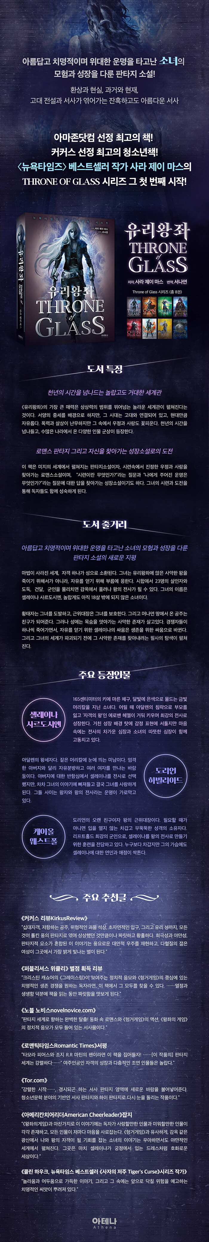 <뉴욕타임즈> 베스트셀러 작가 사라 J. 마스의 기대작 출간!<뉴욕타임스> 베스트셀러 작가 사라 J. 마스의 ‘유리왕좌 Throne of Glass 시리즈가 출간되었다. 사라 J. 마스는 이번에 출간된 ‘유리 왕좌’ 시리즈를 비롯해 ‘가시와 장미의 정원A Court of Thorns and Roses’, ‘초승달 도시Crescent City’ 시리즈로 세계적인 명성을 얻으며 하나의 ‘세계적 현상’이 되고 있는 작가다. 그녀의 작품들은 세계 37개 언어로 번역되어 900만 부 이상 팔렸다.