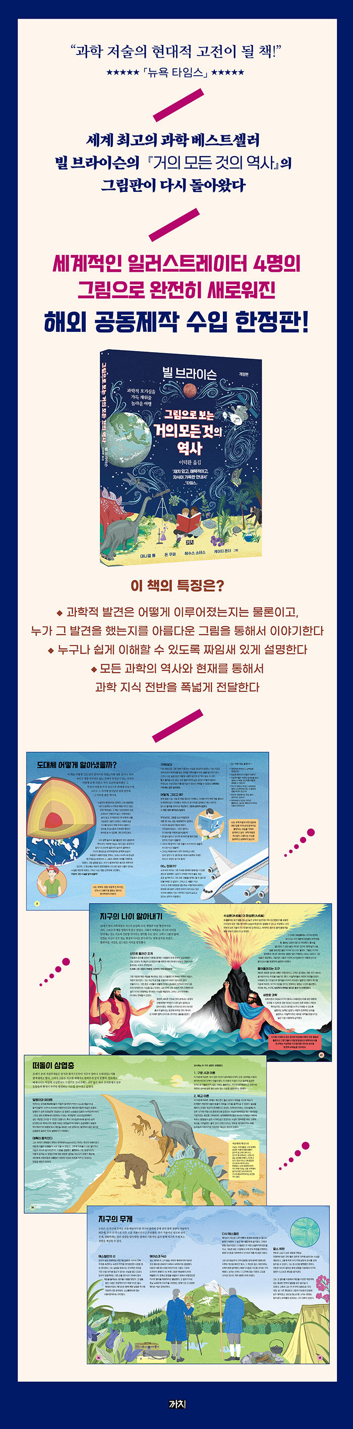 세계적인 베스트셀러 <거의 모든 것의 역사>를 요약, 개정하고 4명의 유명 일러스트레이터들의 그림이 더해져서 새롭게 탄생한 이 책은, <거의 모든 것의 역사>가 가진 장점을 유지하면서도 아름다운 그림을 통해서 그 깊이를 폭발적으로 확장한다. 빌 브라이슨의 훌륭한 이야기 솜씨 덕분에 과학적 발견은 ‘어떻게?’ 이루어졌는가는 물론이고, ‘누가’ 그 발견을 했는가를 누구나 즐기면서 이해할 수 있게 되었다.
