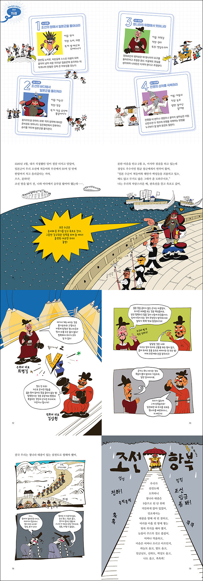 <좌충우돌 조선 전쟁 극복기>에서는 조선을 휩쓸고 지나간 네 차례의 큰 전쟁들과 마주한다. 진주 대첩의 주인공 김시민 장군, 곽재우 의병장, 행주 대첩 권율 장군, 바다의 불패 신화를 남긴 이순신 장군의 활약상은 200여 년간 지속된 평화 속에서 속수무책으로 일본에 당할 수밖에 없었던 임진왜란의 암울함을 씻는 쾌거로 기억된다.