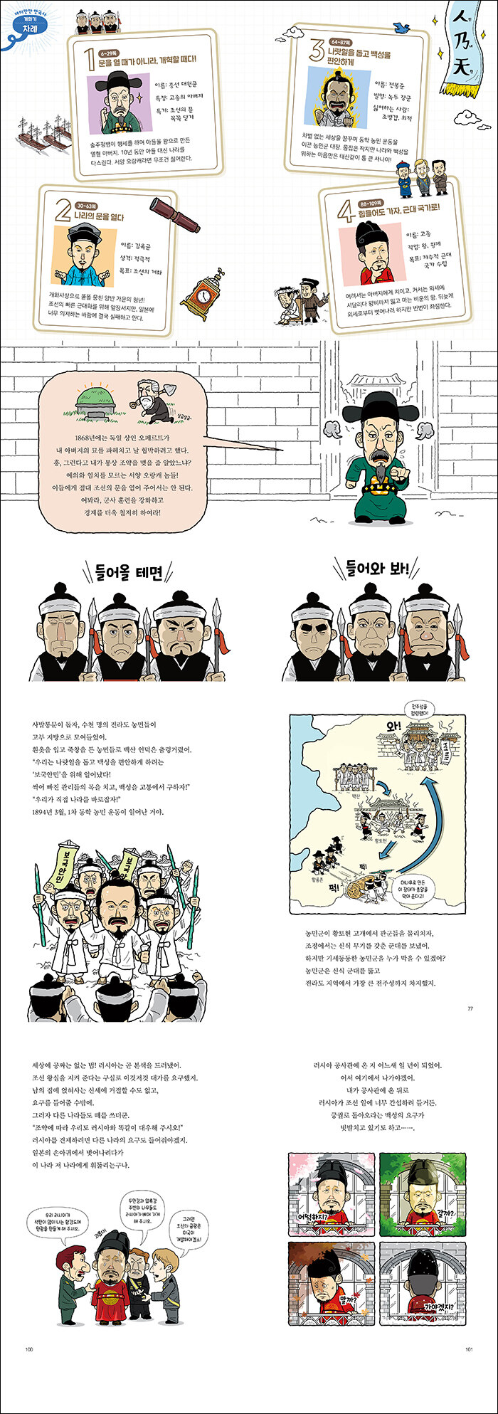 18권에서는 격변의 시대, 그 중심에 있던 인물들의 이야기를 통해 조선 시대 말, 개화기를 관통하는 역사를 생생히 만날 수 있다. 아들을 왕으로 만들고, 무너진 조선 왕실의 위엄을 세우는 동시에 외세를 철저히 배척하며 조선을 보호하려고 했던 흥선 대원군, 급진 개화파의 일원으로 조선의 빠른 근대화를 위해 백방으로 노력하다 갑신정변까지 일으키는 김옥균, 차별 없는 세상을 꿈꾸며 동학 농민 운동에 앞장선 전봉준, 외세에 시달리다 뒤늦게 자주적 근대 국가를 세우려고 노력하지만 뜻대로 되지 않아 번번이 좌절하는 조선의 마지막 왕이자 대한 제국의 첫 번째 황제 고종까지, 조선을 애정하는 마음은 같을지라도 각자의 입장과 관점에서 주장하고 배척하고 투쟁했던 이들이 겪어온 시간들에 함께 참여해 보자.