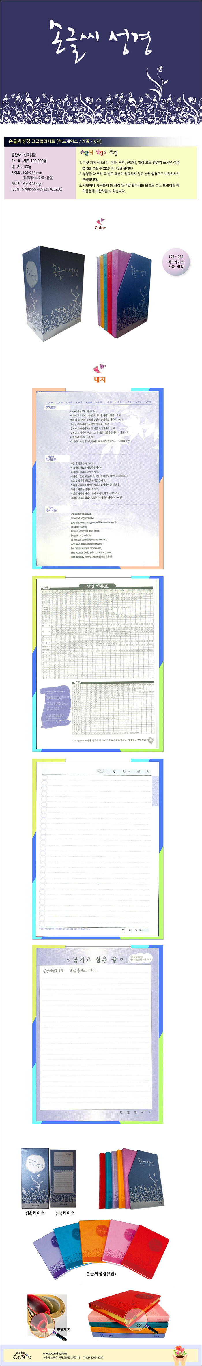 다섯가지 색(보라.청록.겨자.진달래.빨강)으로 한권씩 쓰시면, 성경 전 권을 쓸 수 있다. 성경을 다 쓴 후 별도 제본이 필요하지 않고, 낱권 성경으로 보관하기 편리하다. 시편이나 사복음서 등 성경 일부만 원하는 사람도 쓰고 보관할 때 아름답게 보관할 수 있다.