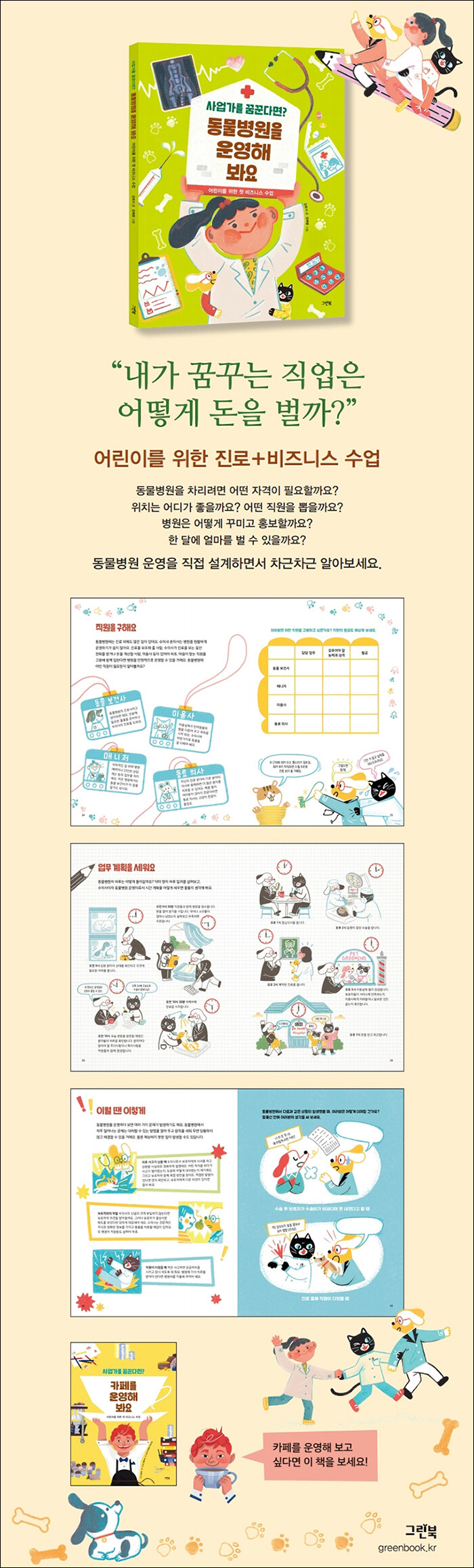 진로와 경제경영 교육을 연결시켜 보다 구체적으로 자기 꿈을 설계할 수 있도록 이끄는 어린이책이 출간되었습니다. 그린북에서 새로 나온 《동물병원을 운영해 봐요》 《카페를 운영해 봐요》 두 권은 어린이들에게 친근한 동물병원과 카페 두 사업체를 중심으로 직업과 직무의 실체를 입체적으로 파악하고, 자기가 원하는 직업으로 어떻게 돈을 벌 수 있는지 자세하게 알아봅니다.