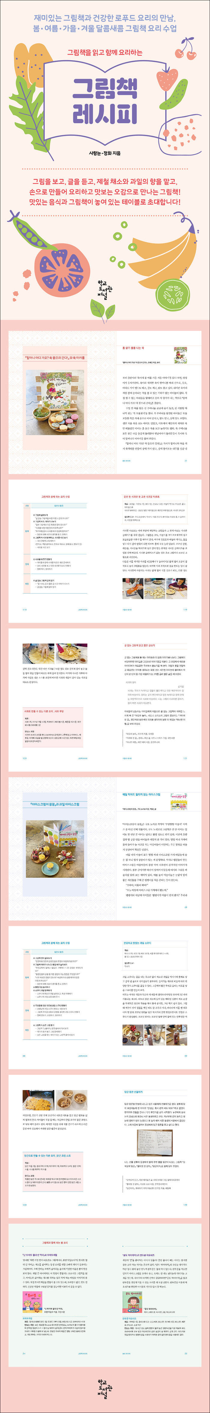 그림책을 이용한 다양한 독후 활동법까지『그림책 레시피』는 봄·여름·가을·겨울 계절별로 그림책을 골라 아이들에게 그림책을 읽어 주면서 이야기를 나누는 것으로 시작된다. 할머니를 따라 쑥을 따러 가고, 야옹이들과 아이스크림을 먹어 치우고, 다람쥐들과 알밤을 따러 가기도 한다. 그런 다음 그림책에 나온 재료를 이용해 직접 요리를 하며 제철 재료를 탐색한다. 봄의 딸기, 쑥, 케일, 키위에서는 향긋하고 달달한 향이 나고, 여름의 수박과 과일 아이스크림, 복숭아 차, 과일 스무디는 무더위를 날려줄 것만 같다. 가을의 알밤과 대추, 사과, 단호박은 풍성한 가을을 맛보게 하고, 겨울의 귤, 아보카도, 당근, 고구마는 추운 겨울을 이겨낼 힘을 주는 듯하다.