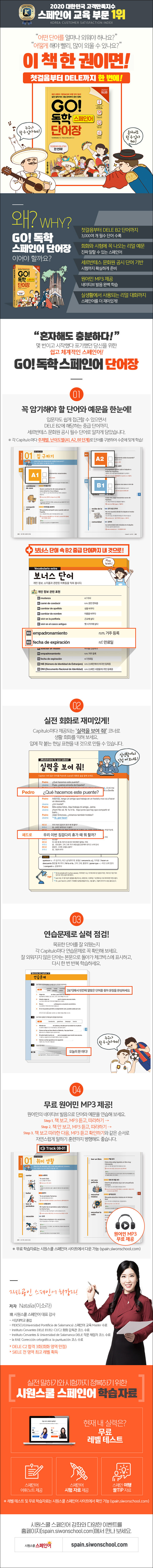 5. 무료 원어민 MP3 제공!스페인어 말문을 틔우고 네이티브 발음을 입에 붙이기 위해서는, 원어민의 음성을 많이 듣고 많이 따라 해야 합니다. 무료로 제공되는 원어민 MP3를 활용하여, 네이티브 발음으로 단어와 예문을 연습해 보세요. Step 1. 책 보고, MP3 듣고, 따라하기→Step 2. 책 안 보고, MP3 듣고, 따라하기→Step 3. 책 보고 따라한 다음, MP3 듣고 확인하기와 같은 순서로 자연스럽게 말하기 훈련까지 병행해도 좋습니다.