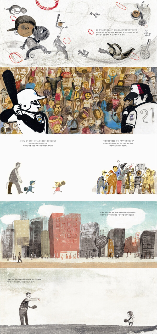 야구는 아버지와 나를 이어준 가장 쉬운 통로였으며 멋진 마술이었다 『마이볼』은 2004년 지인들과 함께 전시회를 열며 만든 ‘뼘책’에 실은 작품을 새롭게 바꾸어 펴낸 것이다. 시간이 흘러 더 이상 아버지와 목욕탕에 가지 않게 되었을 즈음, 아버지에게 표현하지 못한 말들을 편지로 써보자는 생각으로 쓰고 그린 것이 8년 전. 작가는 한동안 묵혀둔 이 작품을 다시 꺼낸다. 그리고 수년에 걸쳐 모든 것을 새롭게 써내려간다. 실크스크린과 판화 기법을 응용, 최종 이미지를 염두에 두고 마음에 드는 장면이 나올 때까지, 수없이 종이를 버려 가며 실험하고 완성하길 수차례. 이제껏 해 보지 않았던 기법인 만큼 인내와 공력이 절실히 요구되었다. 아이에게 공을 던지는 아버지의 뿌듯하면서도 걱정스러운 마음, 자기로 향해 날아오는 공이 두려운 한편으로 설레는 아이의 긴장감이 고스란히 배어나는 그림, 그들 사이에 오고가는 공 하나에 담긴 함의는 미사여구 하나 없이 충분히 감동적이다. “검정 글러브에 바셀린 로션을 듬뿍 바르고 냄새 나는 글러브를 베고 잠이 들”었던 그날은 어제 일처럼 선명하고 낡은 창고에서 뒤져낸 듯한 지난날의 파편들과 그것을 바라보는 눈길은 위트 있고 따스하다.