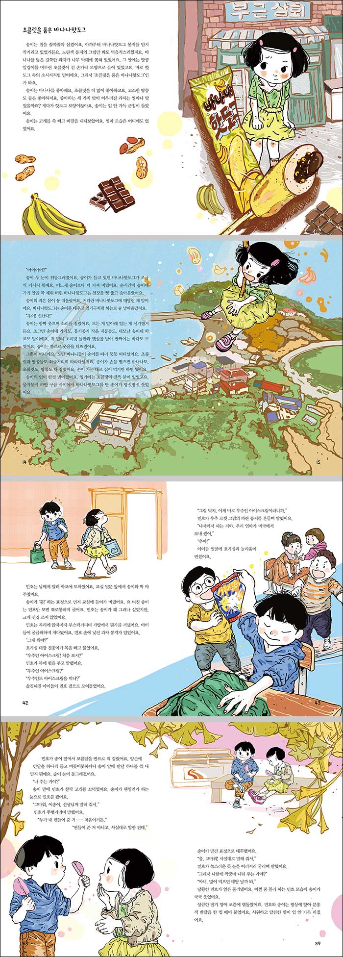 들키고 싶지 않아요엄마 몰래 바나나핫도그를 먹은 송이의 마음은 어땠을까요? 엄마가 알아챌까 봐 마음은 조마조마, 심장은 두근두근, 머릿속은 온통 바나나핫도그로 가득 차 있었을 것입니다. 방금 먹은 바나나핫도그가 얼마나 맛있었는지 새까맣게 잊은 채 말이죠. 이 책의 첫 번째 이야기는 바로 송이의 마음을 단숨에 사로잡은 바나나핫도그의 군침 도는 소개 글로 시작하는 「바나나핫도그」입니다. 땅콩 알갱이를 버무린 초콜릿이 소시지처럼 들어 있는 바나나 모양의 핫도그, 송이가 아까부터 눈을 떼지 못하고 계속 만지작거리고 있는 과자가 바로 바나나핫도그인데요. 엄마가 가게를 비운 사이 바나나핫도그를 몰래 먹기 위해 송이가 고심하는 장면과 뒷일은 생각하지 않고 일을 벌이는 장면에서 순수한 어린아이의 동심이 그대로 전해지는 것 같아 흐뭇하기도 합니다. 송이의 마음을 가까이에서 지켜보고 있는 느낌마저 드는 작가의 묘사가 돋보이는 첫 번째 이야기는 이렇게 우리 마음을 잔잔하게 파고듭니다. 등장인물들의 작은 감정까지 놓치지 않은 최정인 작가의 그림 또한 이야기에 생동감과 웃음을 불어넣어 책 읽는 재미를 더해 줍니다. 송이가 바나나핫도그를 만지작거리는 순간부터 눈물이 말라붙은 얼굴로 엄마에게 매달리는 순간까지 그 시간을 함께 걸어가 보세요.
