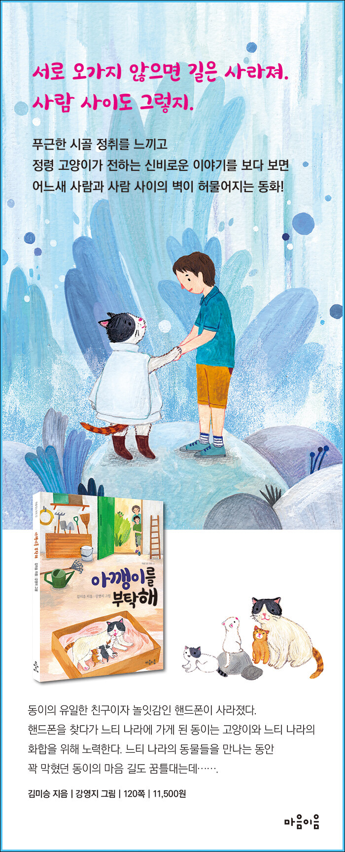 고양이와 아웅다웅하는 모습이 귀여운 <아깽이를 부탁해>는 사람 사이에 끊긴 마음 길들을 터 주고, 관계 맺기를 두려워하는 아이에게 관계에 대한 면역력을 키워 준다.
