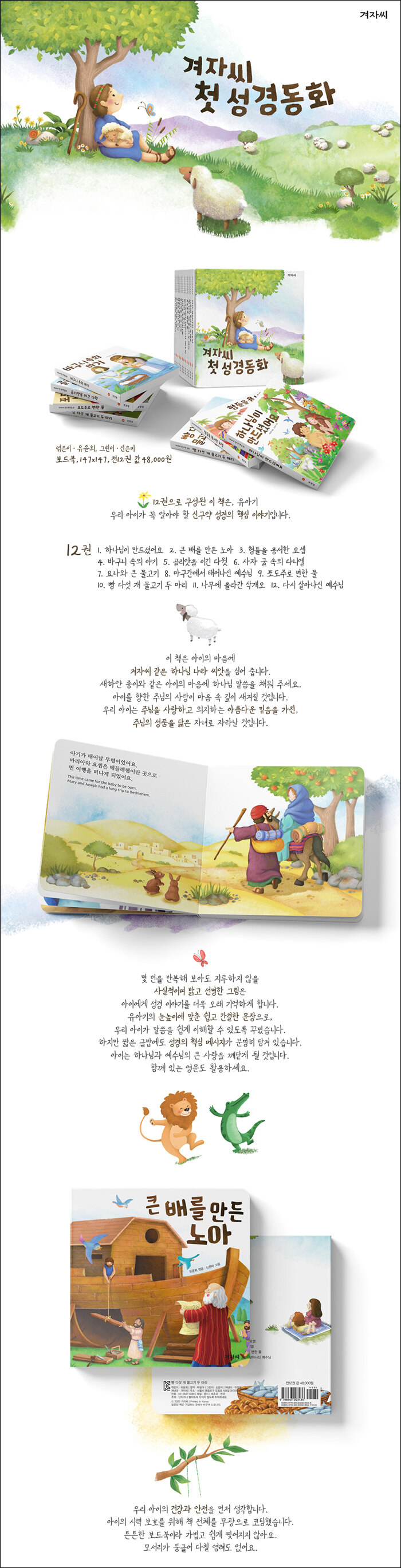 12권으로 구성된 이 책은 유아기 아이가 꼭 알아야 할 신구약 성경의 핵심 이야기다. 사실적이면서도 밝고 따뜻한 일러스트 몇 번을 반복해 보아도 지루하지 않을 사실적이며 밝고 선명한 그림은 아이에게 성경 이야기를 더욱 오래 기억하게 한다. 아이의 시력 보호를 위해 책 전체를 무광으로 코팅했다.