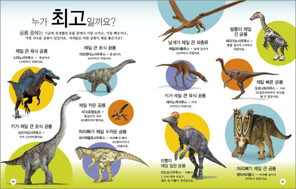 ‘누가 최고 일까?’ ‘용어 설명’, ‘공룡과 선사 시대 이름(영문)’, ‘찾아보기’ 등 세심한 구성!내용 마지막에 공룡들 가운데 주제별 최고를 선정하여 기록과 함께 수록했습니다. 누가 육식 공룡 중 제일 큰지, 누가 머리뼈가 제일 두꺼운 공룡인지, 누가 발톱이 제일 긴 공룡인지 최고 기록을 보유한 공룡을 만나 볼 수 있습니다. 아울러 어려운 용어를 풀어 설명해 놓았으며, 찾아보기로 손쉽게 관심 있는 공룡이 있는 부분을 찾아 읽어 볼 수 있도록 했습니다.