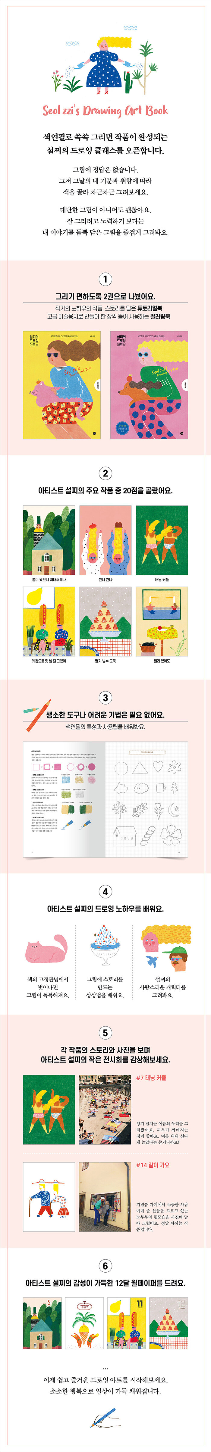 1. 튜토리얼북, 컬러링북 2권 분권 구성튜토리얼북으로 색연필 사용법과 아티스트 설찌의 그림 노하우를 배웁니다. 각 작품의 스토리와 함께 아티스트 설찌의 작은 전시회도 즐길 수 있습니다.