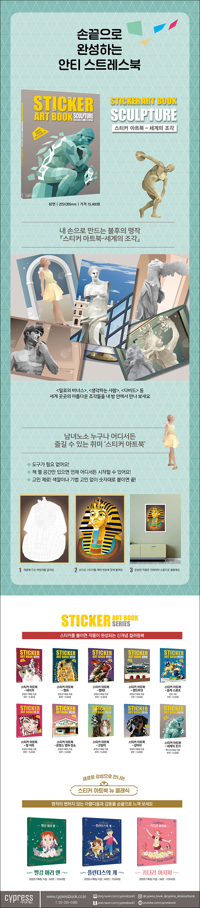내 손에서 재탄생하는 세계의 조각 스티커 아트는 손으로 스티커를 떼어내 붙이기만 하면 된다. 책을 펼칠 공간만 있다면 언제 어디서든 할 수 있다. 지정된 번호에 맞추어 스티커를 붙이기만 하면 불후의 조각 작품이 완성되는 기쁨을 맛볼 수 있어 미술 감각이 없다고 생각하는 사람들도 걱정 없이 즐길 수 있다.
