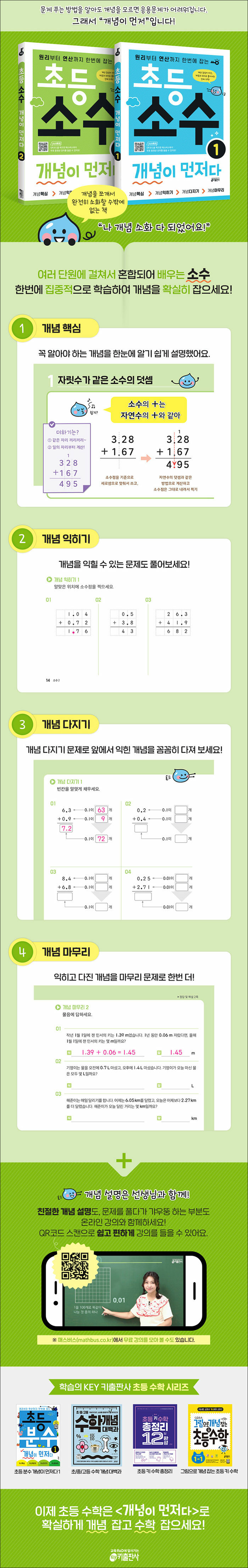 1. 오래 기억할 수 있도록 이미지화한다! 개념을 완전히 이해했다 하더라도, 이해한 개념을 잘 기억하고 있어야 하죠. 그래야 문제를 만났을 때 빠르게 풀 수 있으니까요. 계산에 숨어있는 모든 원리를 설명하고, 기억하기 쉽게 내용을 다시 한번 이미지화하여 보여줍니다. 덧셈과 뺄셈에서 소수점을 어디에 찍어야 하는지, 곱셈을 계산하고 나서 소수점을 어디에 찍어야 하는지, 나눗셈을 계산하고 나서 몫과 나머지의 소수점은 어디에 찍어야 하는지 이미지화 된 소수점을 만나보세요. 오래, 그리고 쉽게 기억할 수 있을 거예요.