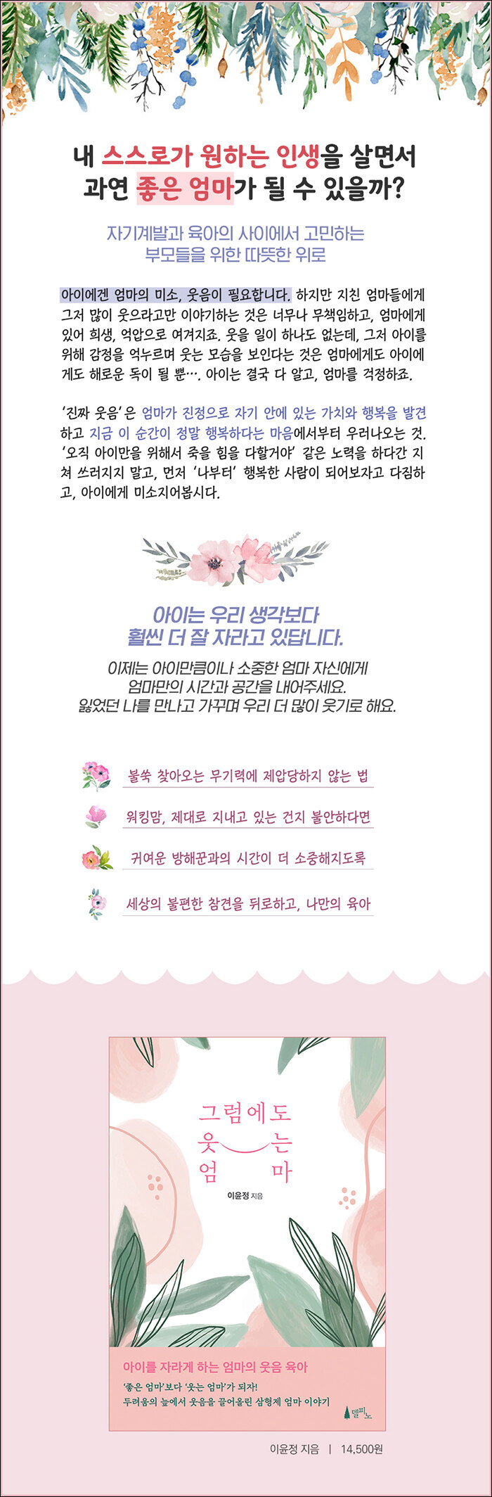 태어날 때부터 심장이 아픈 아이를 키워 오시며 수많은 수술과 치료의 과정을 담대하게 겪어 오신 분이었다. 선생님의 말씀을 듣고 저자는 비로소 햇살 가득한 지상으로 다시 올라올 수 있었다. 흐르던 눈물을 닦아내고 웃는 얼굴로 아이를 마주했다. 구급차를 타고 응급실에 갈 때도, 며칠에 걸쳐 각종 검사를 받느라 지쳐갈 때도, 아이가 생애 첫 입원을 하고 첫 수술을 받으며 두려움에 떨 때도, 힘겹게 회복해 가는 그 시간에도, 구급차 놀이나 펜션 놀이한다 생각하며 즐겨보자고, 아이가 별일 아닌 것처럼 느끼게 하고자 부단히 노력했다. 엄마가 먼저 웃어 보이자 아이는 정말로 자기의 아픔이 얼마나 큰지 알지 못했다. 순간순간 많이 아파했지만 이내 다시 웃었다. ‘엄마가 웃으면 아이도 웃는다’라는 자명한 진리를 병원에서 확인한 셈이다. 그때 저자는 확실히 깨달았다. ‘역시 내 웃음이 먼저구나. 내 밝은 표정이 아이를 살릴 수도 있겠구나.’ 저자가 존경하는 선생님의 말씀 한마디 덕분에 극심한 고통의 늪에서 다시 일어설 수 있었던 것처럼, 힘겨워하고 무기력해진 많은 엄마들이 ≪그럼에도 웃는 엄마≫를 통해 주저앉았던 무릎을 다시 펼 수 있었으면 좋겠다.