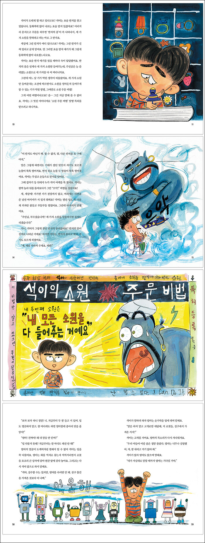 * 가끔은 상상에 빠져도 괜찮아!온갖 노력 끝에 석이는 드디어 요술 반지를 찾아요. 비록 반지의 종을 보고 겁에 질려 사라져 달라고 소원 하나를 써 버리지만, 괜찮습니다. 석이에게는 소원 주문 비법이 있으니까요. 오랫동안 생각해 온 그 천재적인 비법, 석이의 ‘발명 특허 소원 비법’을 말하면 모든 소원을 이룰 수 있지요!
