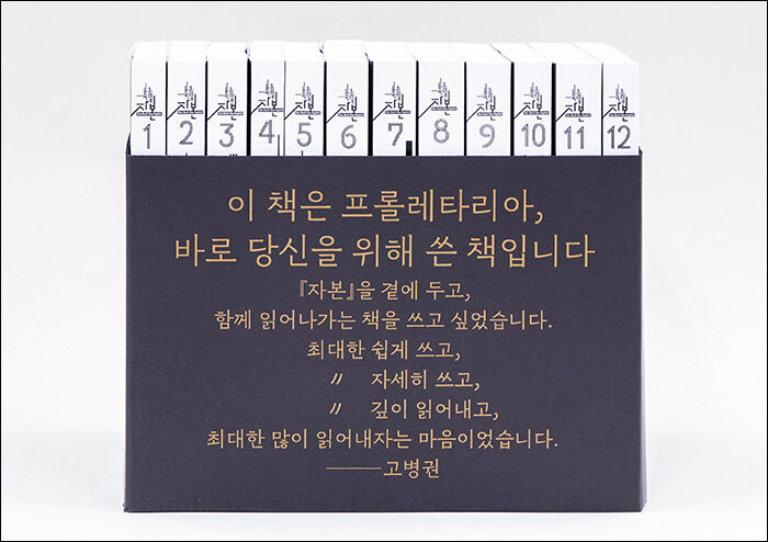 “『자본』을 요약 정리해주는 책이 아니라 『자본』을 직접 읽을 때 도움이 되는 책, 말 그대로 『자본』과 함께 읽어가는 책을 쓰고 싶었습니다. 최대한 쉽게 쓰고, 최대한 자세히 쓰고, 최대한 깊이 읽어내고, 최대한 많이 읽어내자는 마음으로 시작했습니다. 물론 마음처럼 되지는 않았습니다. 부족한 것도 문제였고 넘치는 것도 문제였습니다. (…) 이제 열두 권의 책이 끝났습니다. (…) 이 책의 여정은 여기서 끝나지만 마르크스와 『자본』을 읽는 일은 앞으로도 계속될 것입니다. 부디 이 열두 권의 책이 150년 전의 불을 꺼뜨리지 않고 전달했기를 바랍니다. 어딘가에 있을 사상의 대장장이들에게, 그리고 누구보다도 『자본』을 읽고 세상을 읽고자 하는 프롤레타리아인 당신에게 잘 전달했기를 바랍니다.” - ‘에필로그’에서