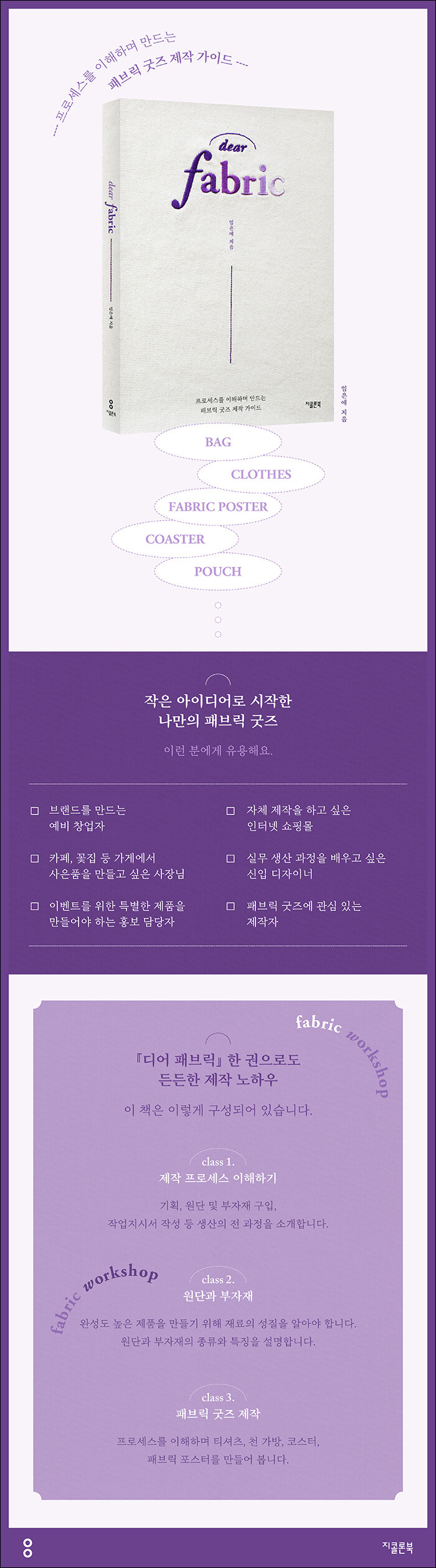 열정 넘치는 제작 현장 속으로패브릭 굿즈 제작이 막막한 이들에게 현장 노하우를 아낌없이 알려주는 든든한 조력자 같은 책 『디어 패브릭』. 이 책에서는 패브릭 제작의 전 과정을 꼼꼼하게 안내해 주고 각 굿즈에 맞는 원단과 부자재의 특징을 소개한다. 실무에 바로 적용할 수 있도록 반팔 티셔츠, 후드 집업, 천 가방, 파우치, 코스터, 패브릭 포스터의 만드는 과정을 하나하나 짚어가며 상세히 설명한다.