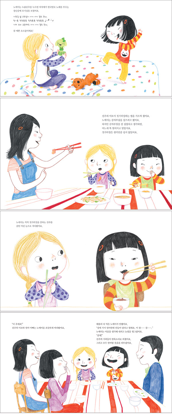 진주는 자기와 얼굴색도 다르고, 언어도 다른 노에미에게 천천히 한국 문화를 소개해 줍니다. 노에미 또한 진주의 설명에 귀를 기울이며 자기 나라와 다른 문화를 체험해 보지요. 새로운 문화는 겪는 모든 사람에게 낯선 경험입니다. 이 경험은 설레는 동시에 두렵고 무섭기도 하지만 조금만 마음을 열고 신기하고 낯선 문화를 받아들여 보세요. 프랑스 문화를 접한 진주처럼, 한국 문화를 접한 노에미처럼 재미있고 색다른 경험이 큰 기쁨으로 다가올 것입니다.