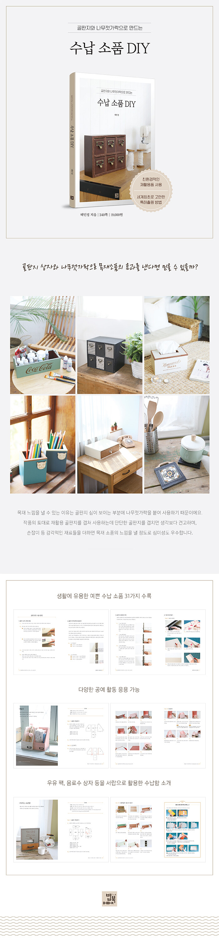 골판지와 나무젓가락 등 일상의 재활용품을 소재로 다양하고 예쁜 수납소품을 만드는 DIY의 세계를 알려준다. 책은 골판지, 나무젓가락, 우유팩, A4용지나 박카스 상자 등 소재별로 만드는 다양한 수납함과 그 방법을 누구나 쉽게 따라 하는 DIY로 정리해서 보여준다. 한정된 재활용품을 소재로 하지만 만들 수 있는 소품은 의의로 다양하고 무궁무진하다.
