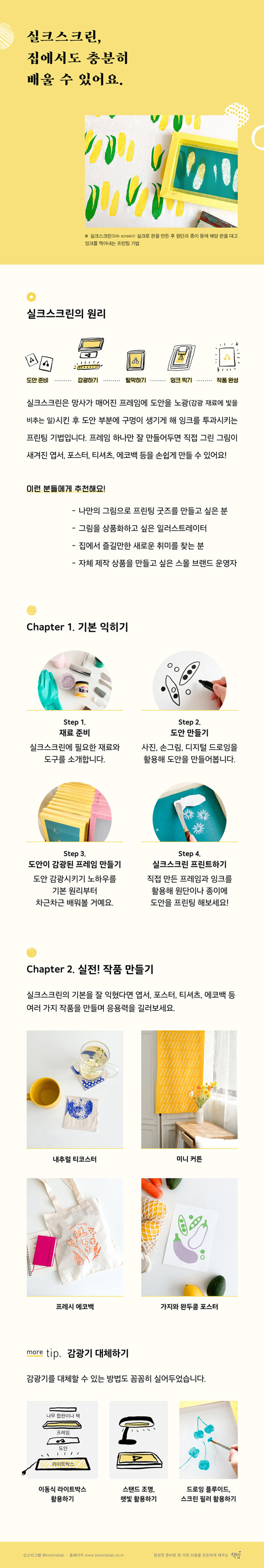 아날로그의 감성은 살리면서 하나하나 일일이 만들어야 하는 수공예보다는 훨씬 경제적이다. 대신 ‘감광기’라는 낯선 도구가 필요하다. 이 책에서는 실크스크린의 기본 원리를 안내하기 위해 감광기 사용법을 충분히 다뤘지만, 감광기가 없더라도 취미 삼아 실크스크린에 도전해 볼 수 있도록 대체법을 상세하게 소개했다. 오늘 처음 실크스크린에 관심을 갖게 된 분들도 원리부터 작품 만들기까지 전 과정을 금세 파악할 수 있도록 사진과 친절한 설명을 꼼꼼히 실었다.