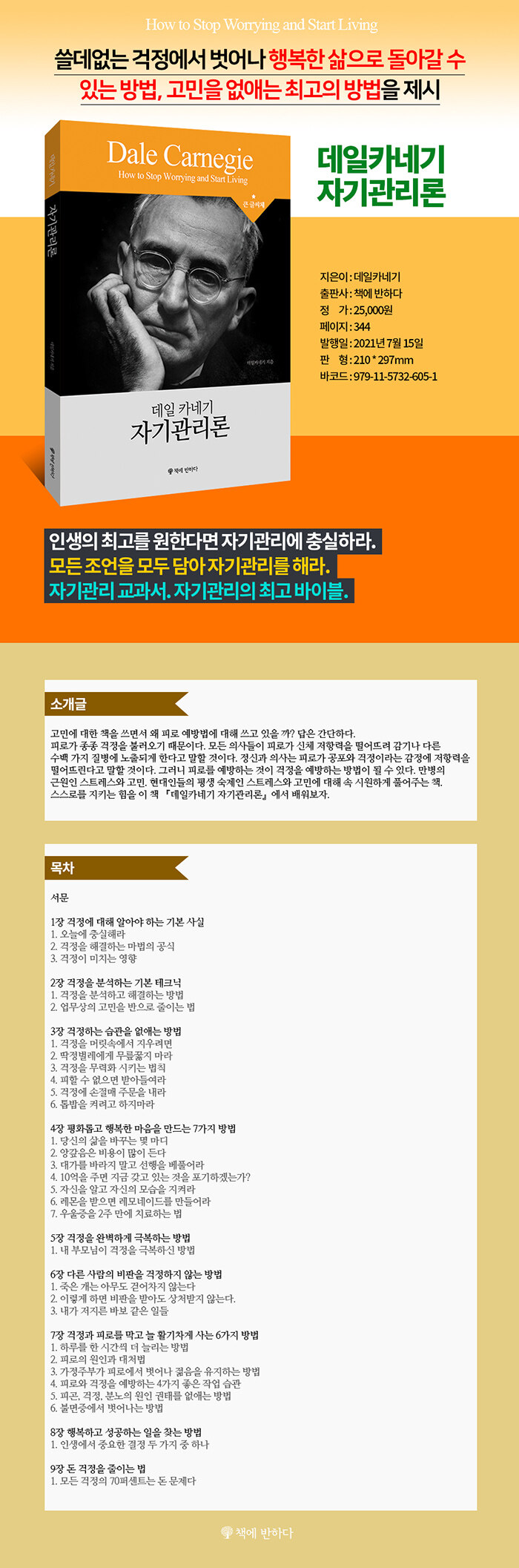자기계발 분야의 선구자로 손꼽히는 데일 카네기는 1888년 미국 미주리주에서 가난한 농부의 아들로 태어났다. 꼭두새벽부터 농사일을 도와야 하는 환경에서도 배움에 대한 열정을 품고 꿈을 향해 정진했다. 어렸을 때부터 사람들 앞에서 말하기를 즐겼으며 학교 토론팀에서 활발하게 활동했다. 워런스버그 주립 사범대학을 졸업한 뒤에는 교사, 세일즈맨 등 사람을 대하는 여러 직업을 거쳤다.세일즈맨을 그만둔 뒤 한동안 생활고를 겪기도 했으나 1912년부터 YMCA에서 대화법 및 대중연설을 가르치며 일생의 전환점을 맞이했다. 그때까지 성인들을 대상으로 인간관계를 교육하는 프로그램은 전무했다. 풍성한 사례와 더불어 당장이라도 적용할 수 있을 만큼 실용적인 원칙을 제시한 그의 강의에 사람들은 열광했다. 뿐만 아니라 그의 수업 시간은 많은 사람이 본인의 경험과 노하우를 나누는 장이 되었다. 그는 이를 바탕으로 ‘카네기 연구소’를 설립해 자기계발 분야에서 기념비적인 업적을 남겼다. 처세, 자기관리, 화술, 리더십 등에 대한 그의 가르침은 오늘날에도 수많은 사람을 성공으로 이끌고 있다.카네기의 책은 핵심을 찌르는 원칙과 구체적인 실행법으로 정평이 나 있는데, 그중에서도 『자기관리론』은 『인간관계론』과 함께 불후의 고전이요 자기계발서의 바이블로 손꼽힌다. 만약 중요한 부분에 밑줄을 그어가며 읽는다면, 완독했을 때 깨끗한 면을 찾기란 쉽지 않을 것이다.
