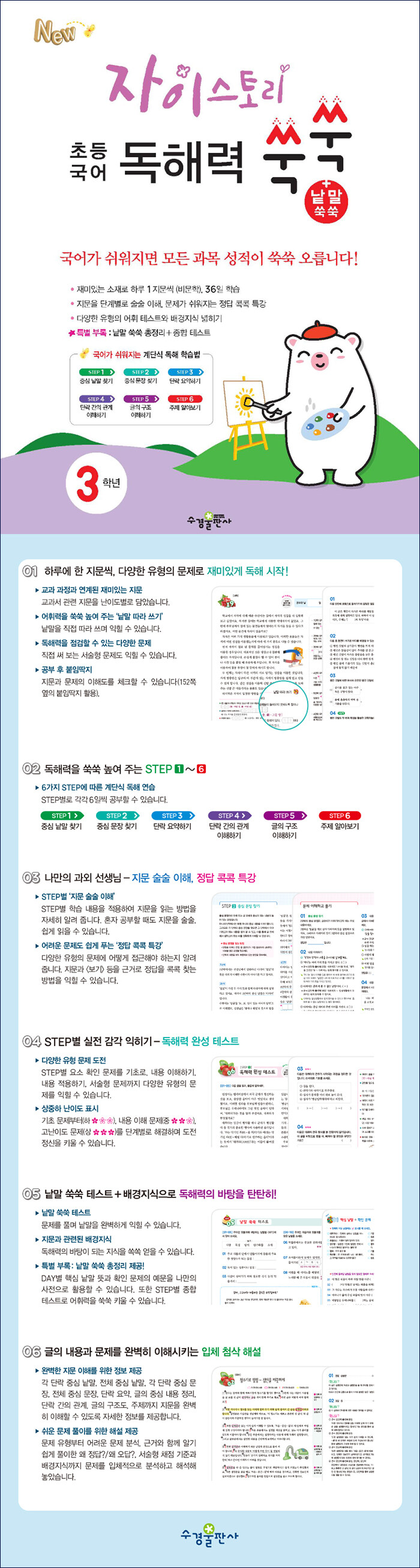 《자이스토리 초등 국어 독해력 쑥쑥+낱말 쑥쑥》 시리즈는 교과서와 연계된 흥미로운 소재의 지문으로 계단식 독해 훈련을 할 수 있도록 구성된 교재입니다. 재미있는 지문으로 쉽게 공부하여 국어 독해력을 높이면 모든 과목의 성적을 올릴 수 있습니다.