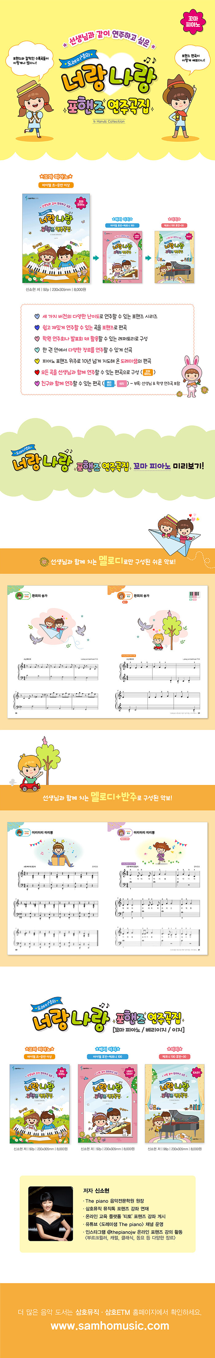 둘이서 멋지게 피아노 연주하고 싶을 때는? 너랑나랑 포핸즈!둘이서 재미있게 연주할 수 있는 곡을 선곡하여 포핸즈 버전으로 쉽게 편곡한 피아노 연주곡집이다. 학원 연주회나 발표회 때 활용 가능한 레퍼토리로, 한 권 안에서 다양한 장르를 연주해 볼 수 있다. 특히, 피아노 포핸즈 위주로 10년 넘게 지도해 온 ‘도레미샘’ 신소현 원장의 편곡으로 학원 실정에 맞는 편곡을 만나 볼 수 있다. [꼬마 피아노] 버전에서는 모든 곡을 선생님과 함께 연주할 수 있는 편곡으로 구성되어 있다(총 30곡). 혼자가 아닌 두 사람이 함께 연주하면서 더욱 아름답고 풍성한 하모니를 느껴 보자.