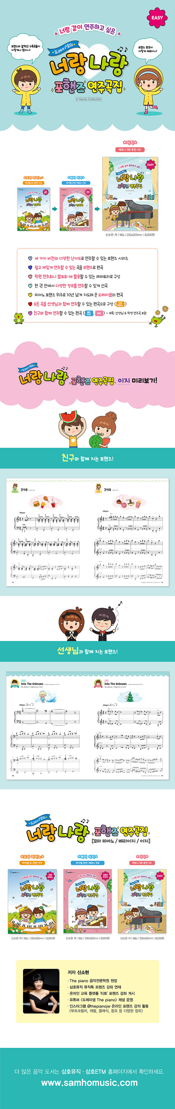 ▶ 둘이서 멋지게 피아노 연주하고 싶을 때는? 너랑나랑 포핸즈!둘이서 재미있게 연주할 수 있는 곡을 선곡하여 포핸즈 버전으로 쉽게 편곡한 피아노 연주곡집이다. 학원 연주회나 발표회 때 활용 가능한 레퍼토리로, 한 권 안에서 다양한 장르를 연주해 볼 수 있다. 특히, 피아노 포핸즈 위주로 10년 넘게 지도해 온 ‘도레미샘’ 신소현 원장의 편곡으로 학원 실정에 맞는 편곡을 만나 볼 수 있다. [EASY] 버전에서는 친구와 함께 연주할 수 있는 14곡과 선생님과 함께 연주할 수 있는 2곡으로 구성되어 있다. 혼자가 아닌 두 사람이 함께 연주하면서 더욱 아름답고 풍성한 하모니를 느껴 보자.