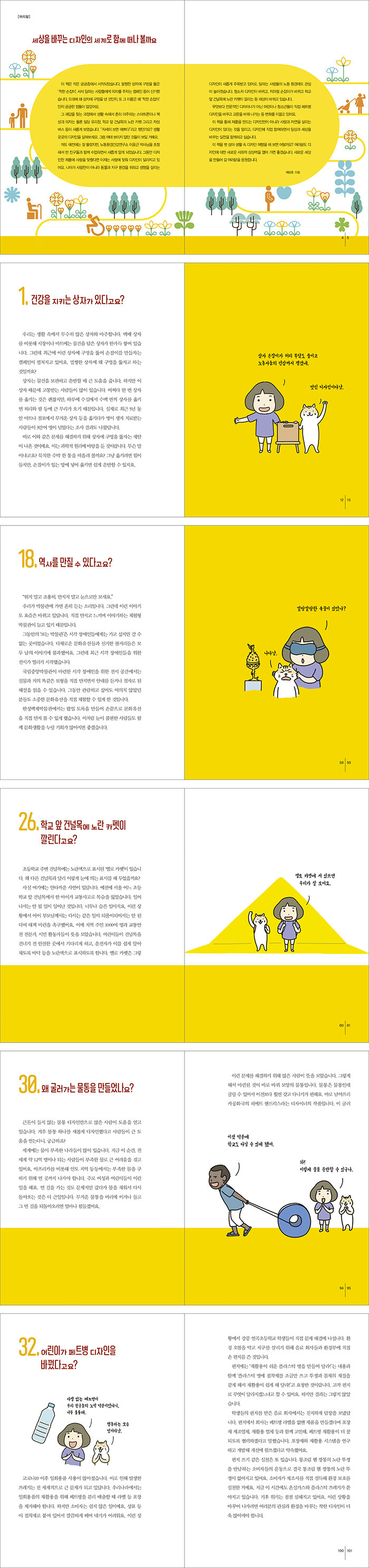 택배 상자에 왜 손잡이를 만드는지, 마트에서 서서 일하는 노동자에게 왜 의자가 필요한지, 도로변에 생태 통로를 왜 만들어야 하는지, 빌딩 유리창에 왜 스티커를 붙여야 하는지 등 어린이가 생활 주변의 디자인과 관련해 궁금해하거나 꼭 알아야 할 부분을 33개 질문과 답변을 통해 살펴본다.