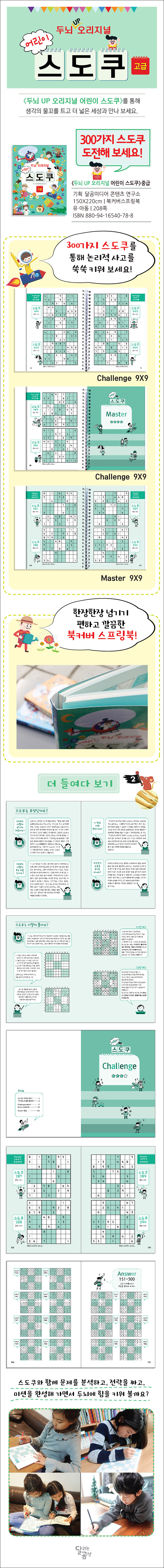 * 북커버 스프링 제본으로 간편함을 더했습니다. 《두뇌 UP 오리지널 어린이 스도쿠》는 북커버 스프링 제본으로 제작하여 독자들이 사용하는 데 불편함이 없도록 만들었습니다. 숫자를 적을 때 책이 자꾸 접히지 않고, 필요시 떼어 내서 풀어 봄으로써 스도쿠 퍼즐 게임에 좀 더 집중할 수 있도록 하였습니다.
