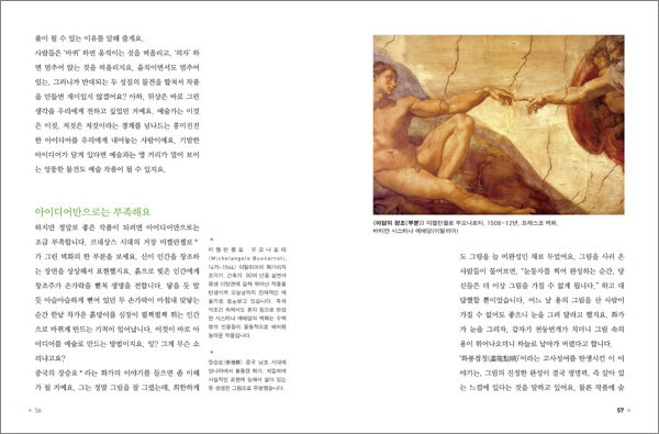 “이미지를 보면서 기억 창고에서 자기만의 경험을 꺼내어 새로운 의미를 만들어 보세요. 이것이 바로 창의적인 생각입니다. 창의력은 늘 관심을 가지고 관찰할 때, 매일매일 어떤 것을 반복해서 생각하고 있을 때 비로소 다가온답니다. 엉뚱한 상상을 두려워하면 아무런 생각도 할 수 없게 됩니다. 정말로 두려운 것은 엉뚱한 생각이 아니라 스스로 생각해 낼 줄 모르는 것이랍니다. 언제나 남들이 생각한 것 안에서만 머무는 것이 진짜 기죽는 일이지요.”