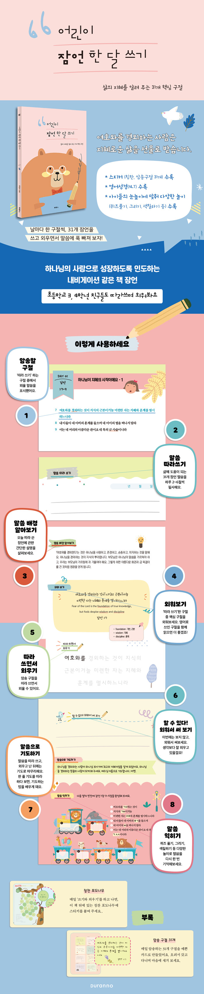 아이들의 눈높이에 맞춰 퀴즈 풀기, 그리기, 색칠하기 등 다양한 놀이를 마련, 필사와 암송을 재미있게 할 수 있다. 쓰기와 외우기 미션이 끝나면 부모와 아이가 서로 칭찬 스티커를 붙이며 격려할 수 있고, 암송 카드 31개를 가지고 다니며 활용할 수 있도록 했다.