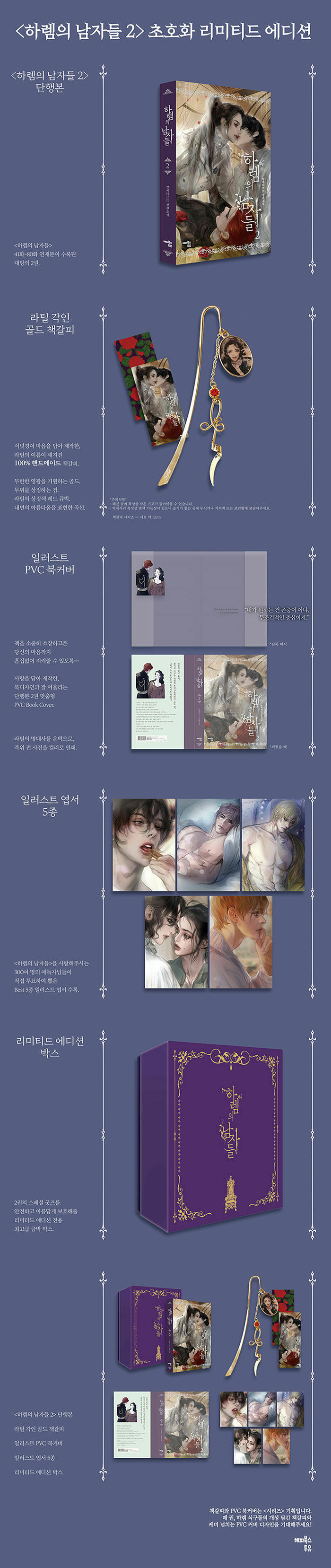 《하렘의 남자들》 2권 출간을 기념하여 제작된 〈리미티드 에디션〉은 주인공 라틸의 이름이 각인되어 있는 100% 핸드메이드 ‘골드 책갈피’와 라틸의 명대사는 은박으로 즉위 전 사진은 칼라로 인쇄된 ‘PVC 북커버’, 독자 투표로 선정된 ‘일러스트 엽서 5종’이 포함되어 있고 작가 사인이 인쇄되어 제공된다.