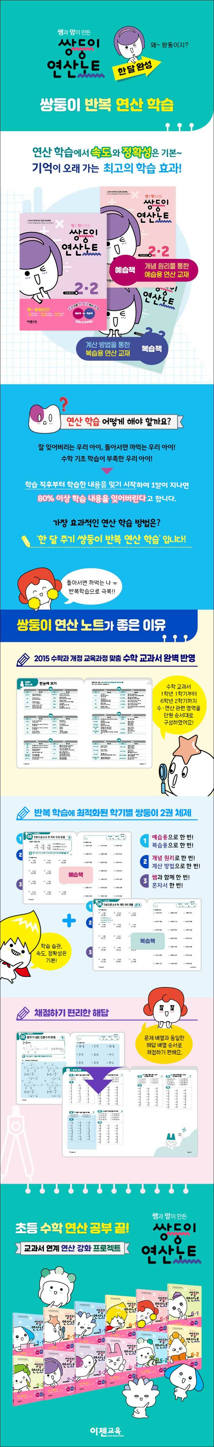 '주기 복습'을 통한 반복 학습입니다.쌍둥이 연산 노트는 교과서의 연산과 관련된 모든 영역의 문제를 교과 순서에 맞게 단원별로 묶어 한 학기 2권으로 반복 학습을 할 수 있도록 구성하였습니다.