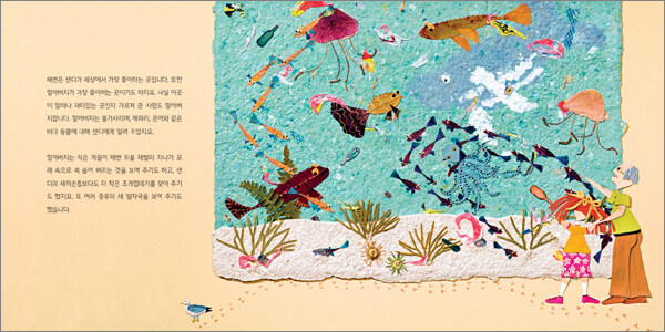 그런데 이번 여름, 샌디는 별로 즐겁지가 않습니다. 샌디가 즐겁게 뛰어놀던 그 아름다운 해변이 온통 쓰레기 더미로 가득 차 있었기 때문입니다. 반쯤 타다 남은 통나무에 핫도그 조각, 찌그러진 탄산음료 깡통, 빈 팝콘 봉지, 플라스틱 겨자통, 감자칩 봉지, 심지어 오이피클까지 바닷가가 지저분한 쓰레기투성이었지요.