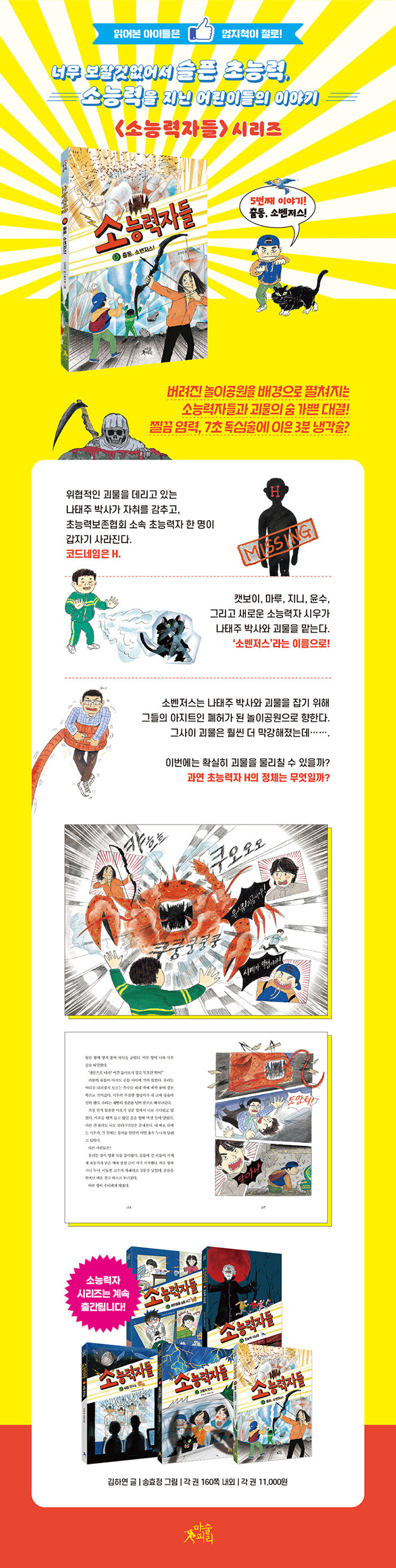 # 신선한 소재와 흡입력 있는 스토리라인으로 독자를 사로잡은 김하연 작가어린이 잡지 《개똥이네 놀이터》에 〈날아라 모네 탐정단〉을 연재하며 작품 활동을 시작한 김하연 작가는 이후 동화와 청소년 소설을 넘나들며 작품 세계를 넓혀 가고 있다. 〈소능력자들〉 시리즈는 작가가 무한한 애정을 가지고 상상을 펼쳐 가는 작품으로, 신선한 소재, 흡입력 있는 스토리 라인, 탄탄한 문장 속에 작가 특유의 유머가 숨어 있다.