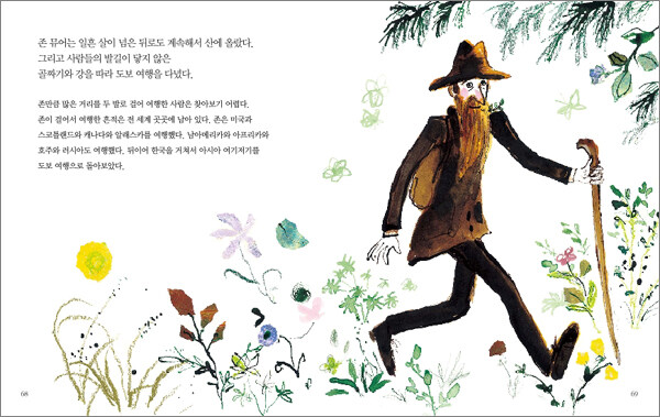 존 뮤어는 미국의 대표적인 환경 운동가이다. 그렇다면 같은 환경 운동가로 불리면서 사상가인 소로와 과학자인 카슨과는 어떻게 다를까? 존 뮤어는 전 세계 곳곳을 두 발로 걸어 다닌 도보 여행가이다. 수많은 산을 오르고, 사람들의 발길이 닿지 않은 골짜기를 걸었으며, 자연 속에서 잠들고 자연과 더불어 살았다. 일흔이 넘은 나이에도 도보 여행을 멈추지 않았다.