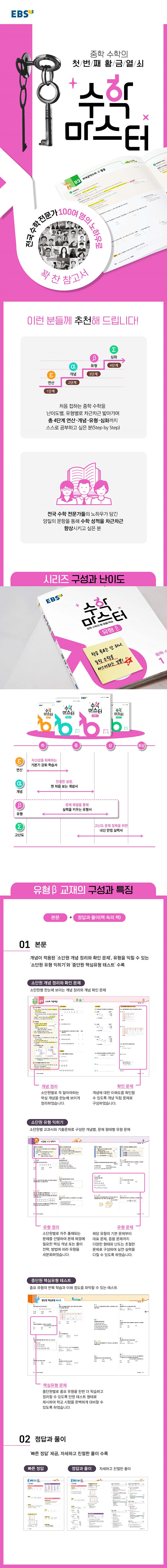 전국 수학 전문가 100여 명의 노하우로 꽉 찬 "수학 마스터" 중학 수학. 소단원별 한눈에 보이는 개념 정리와 개념 확인 문제로 소단원 개념을 정리하고 유형을 익힐 수 있다. 중요 유형의 반복 학습과 이해 정도를 파악할 수 있는 테스트와 자세하고 친절한 풀이를 제공한다. 처음 접하는 중학 수학을 난이도별, 유형별로 차근차근 밟아가며 학습할 수 있다.
