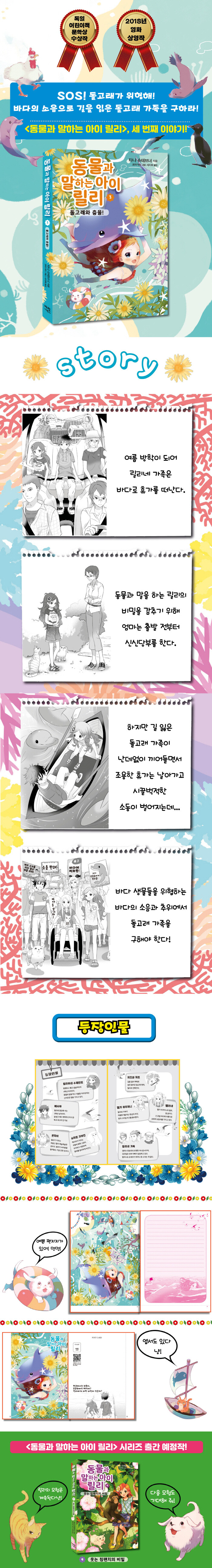 신기한 힘을 가진 소녀 릴리와 영재 소년 예사야의 돌고래 가족 구출 작전! <동물과 말하는 아이 릴리>는 2007년 독일에서 첫 작품이 출간된 이후 10만 권이 넘게 판매되며 돌풍을 일으킨 시리즈로, 세계 여러 나라에 번역 출판되어 많은 사랑을 받았다. 시리즈의 첫 번째 책인 ≪코끼리를 구해 줘!≫는 2008년 독일 어린이책 문학상인 골든북 상을 수상하였다.
