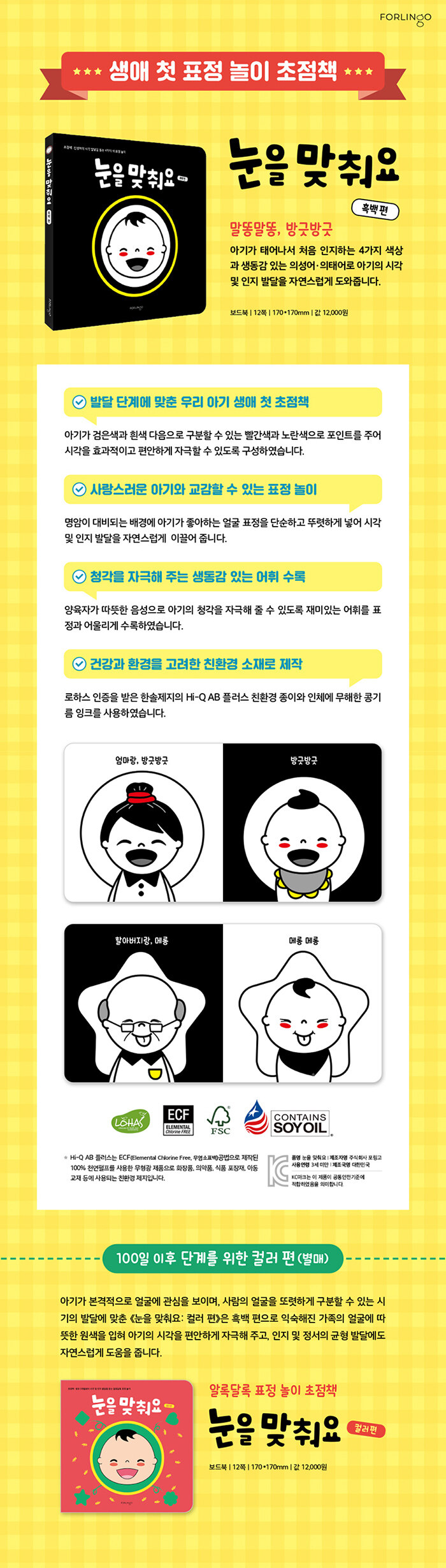 * 유아 교육 전문가가 감수한 우리 아기 생애 첫 초점책20여 년 경력의 국공립 어린이집 교사 출신인 전문가와 함께 아기의 시각 및 인지 발달 단계에 맞게 내용을 구성하였습니다. 아기가 검은색과 흰색 다음으로 구분할 수 있는 빨간색과 노란색으로 포인트를 주어서 시각 발달을 단계별로 효과적이고 편안하게 자극할 수 있도록 하였습니다.